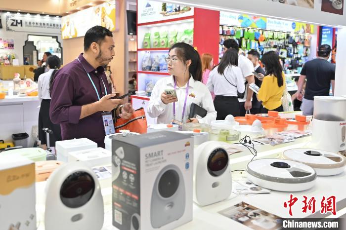 5月3日,境外采购商在广交会通过网络视频分享广交会宠物用品。中新社记者 陈骥旻 摄